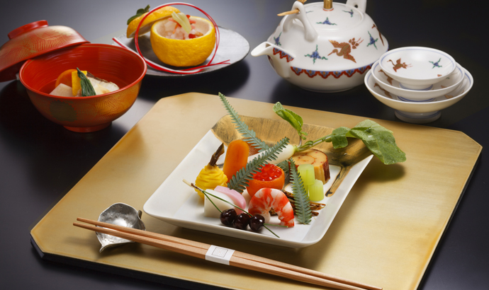 日本の伝統的なお雑煮碗を組み入れたお正月ならではの特別な会席コースです。祝い肴としておせち料理の定番、数の子や田手作り、伊達巻やからすみなど、新春に華やぎを添えるおめでたい特別なお料理の数々を盛り込みました。